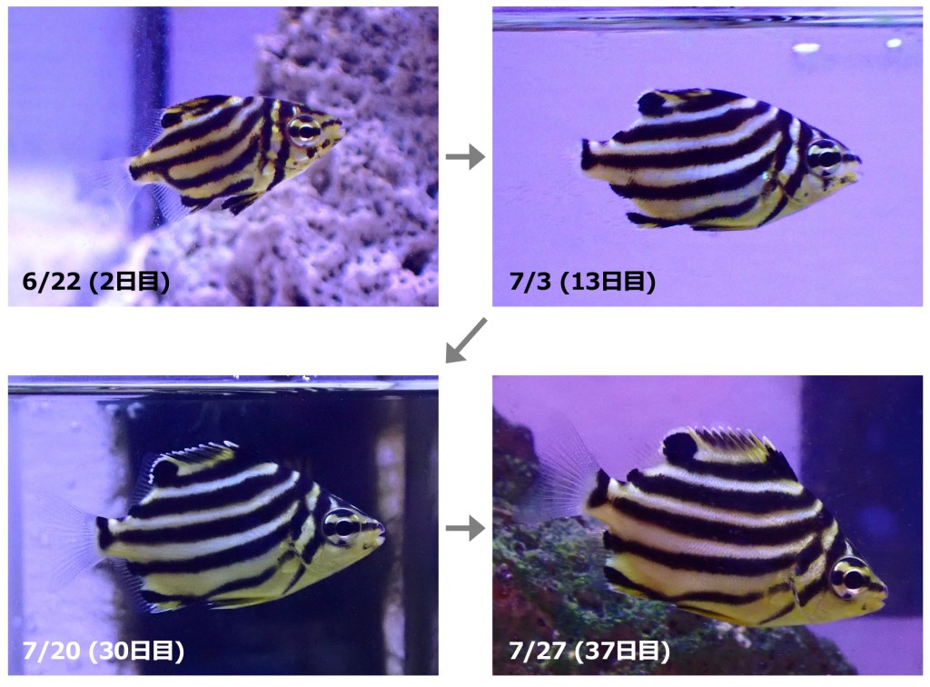 分かりやすいところだと、タイドプール水槽のカゴカキダイ幼魚はここ1ヶ月ほどでしっかり大きくなり、体高も出てきて成魚のようなシルエットになってきました。体長も採集時から倍ほどになっています。