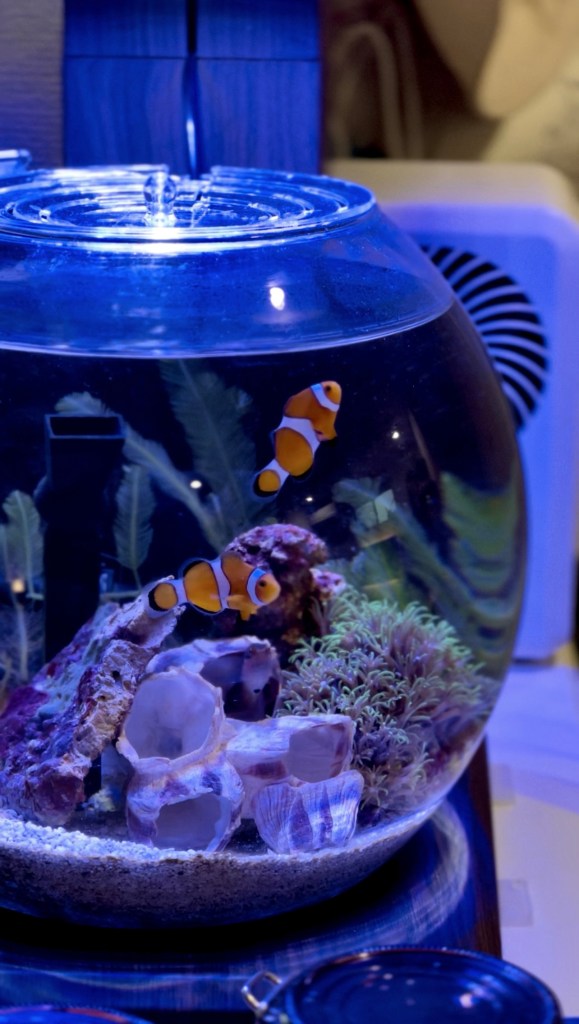 マリンボトルという小さな飼育槽の中に水中ポンプやホースなどを入れまくるのはスペース的にも見た目的にも難がありますが、ペルコの場合、いくらか機材を隠せるろ過槽を配備しているので、ペルコを選んだという背景もあります。