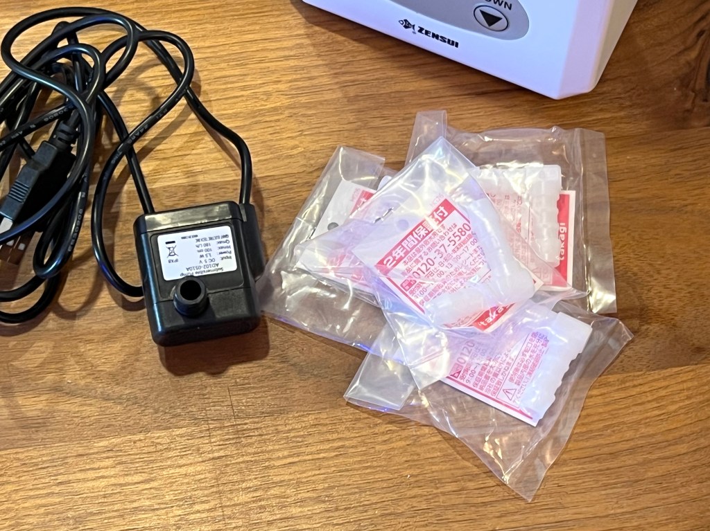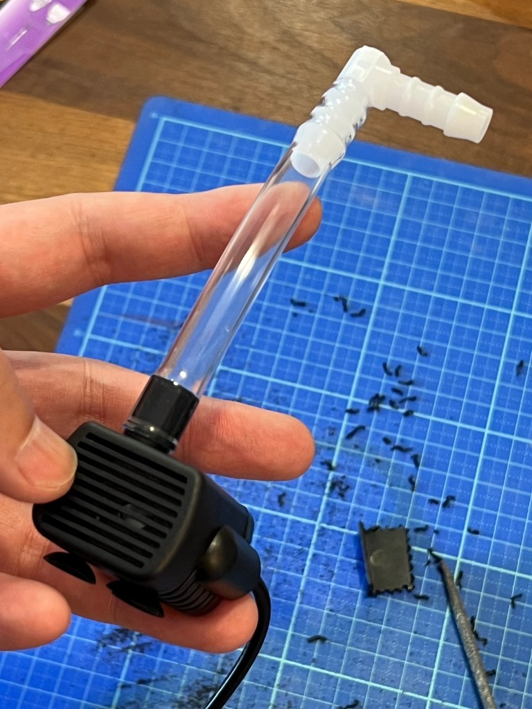 水中ポンプの排出口のアタッチメントは外れるタイプだったので、瞬間接着剤で接着しておきました。