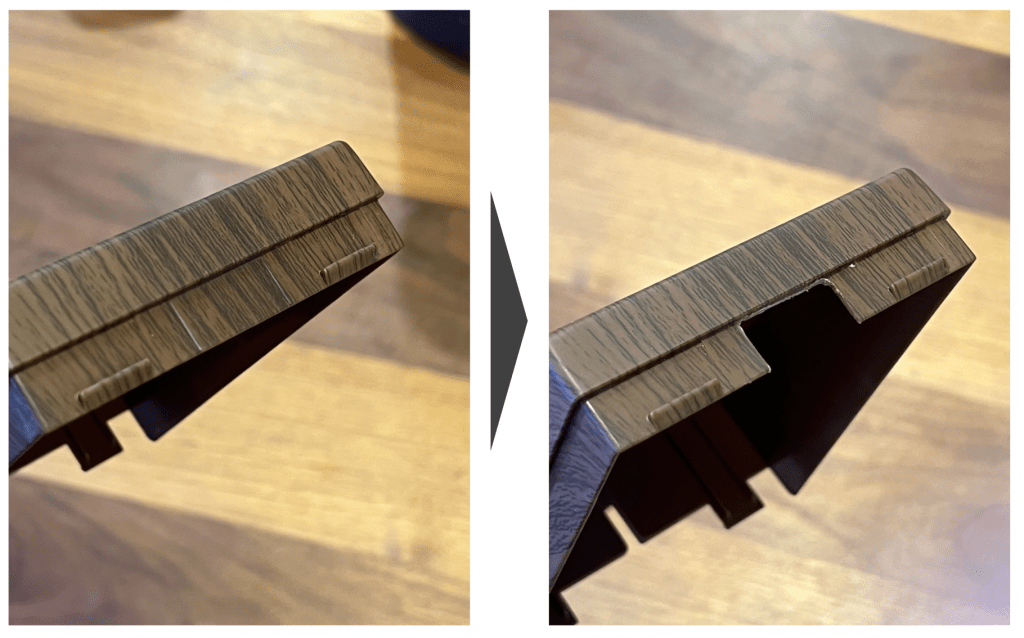 ケーブルの抜け穴で干渉する部分を鉛筆で印付けし、ニッパでカットします。割らないよう、急がず、ちまちまとカットしていきます。その後、ヤスリをかけて滑らかに仕上げます。
