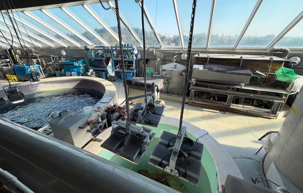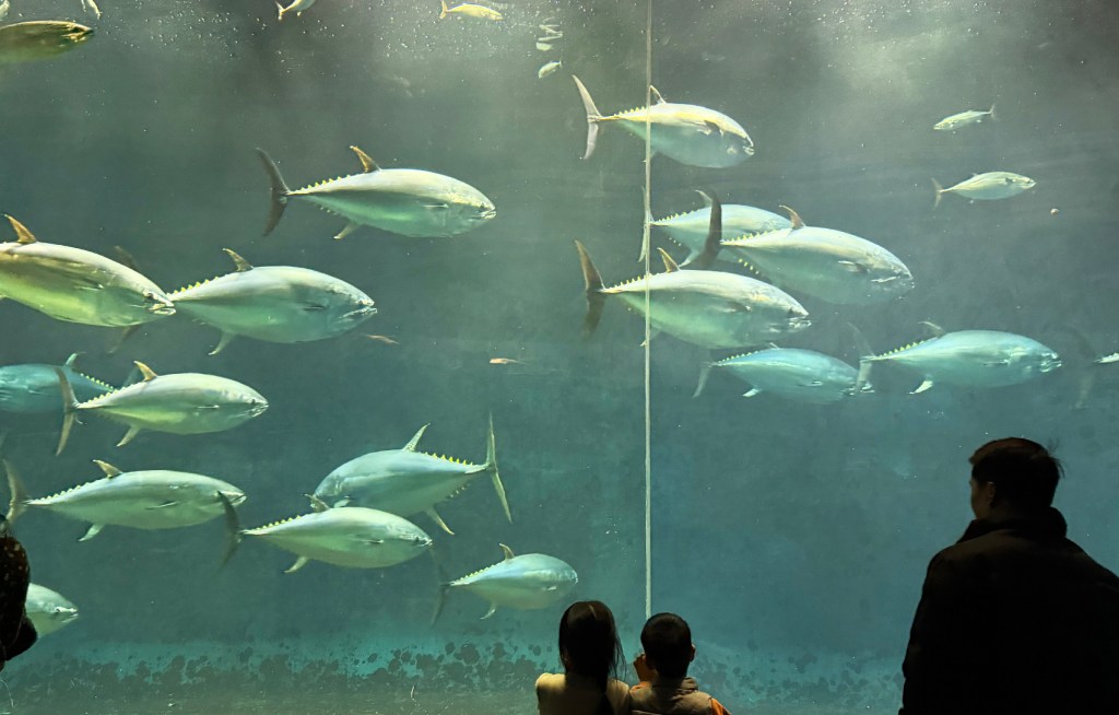 ドーナツ型の水槽でありながら、その一部のスペースを共用するサメ水槽とは網で区切られており、マグロたちは水槽をぐるぐる泳ぎ回ることができず、頻繁に泳ぐ向きを変えて、右へ左へ行ったり来たりしています。